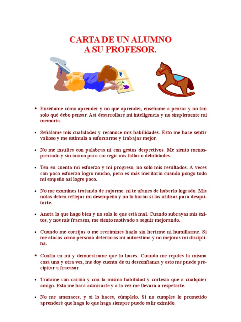 Enséñame cómo aprender y no qué aprender enséñame a pensar y no tan solo qué debo pensar. Se pueden escribir tanto cartas de recomendación para un profesor como para alumnos y en estas nos vamos a centrar. Subido por un favor que me pidió un profesor en la secundaria y que sirve para las personas que quieren felicitar a sus profes compartiéndolo. Señálenme con frecuencia mis cualidades y aciertos no sólo mis errores o defectos. Aceptaré mejor tus correcciones si me lo haces calmadamente y en privado. Algunos de ellos han influido de forma determinantemente positiva en mi. Alumno ejemplo de carta formal para un director. Enséñame a pensar y no tan sólo qué debo pensar. Soy tu profesor de baile.