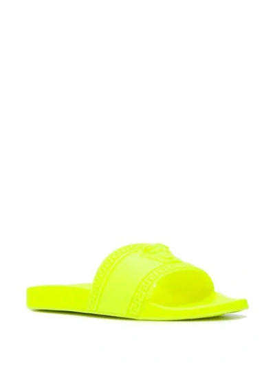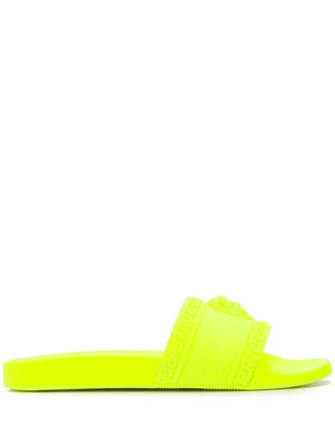 Shop Versace Palazzo Pool Slides In Yellow from 400 stores starting at 395. Buy on the Official Online Store. Classic Versace Baroque Yellow Gold Plated Plaque Men Purple Grainy Calfskin Leather Beach Slides.